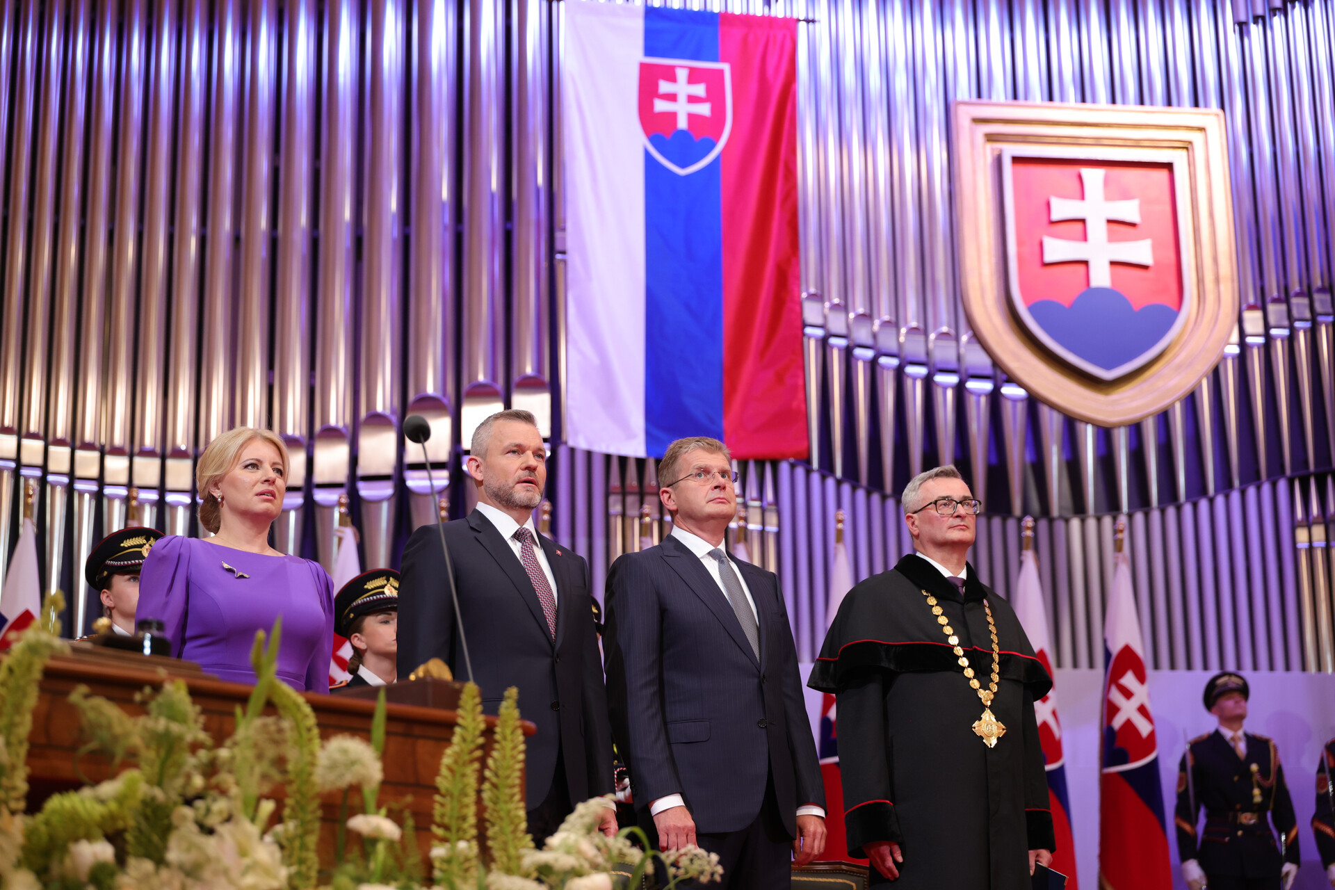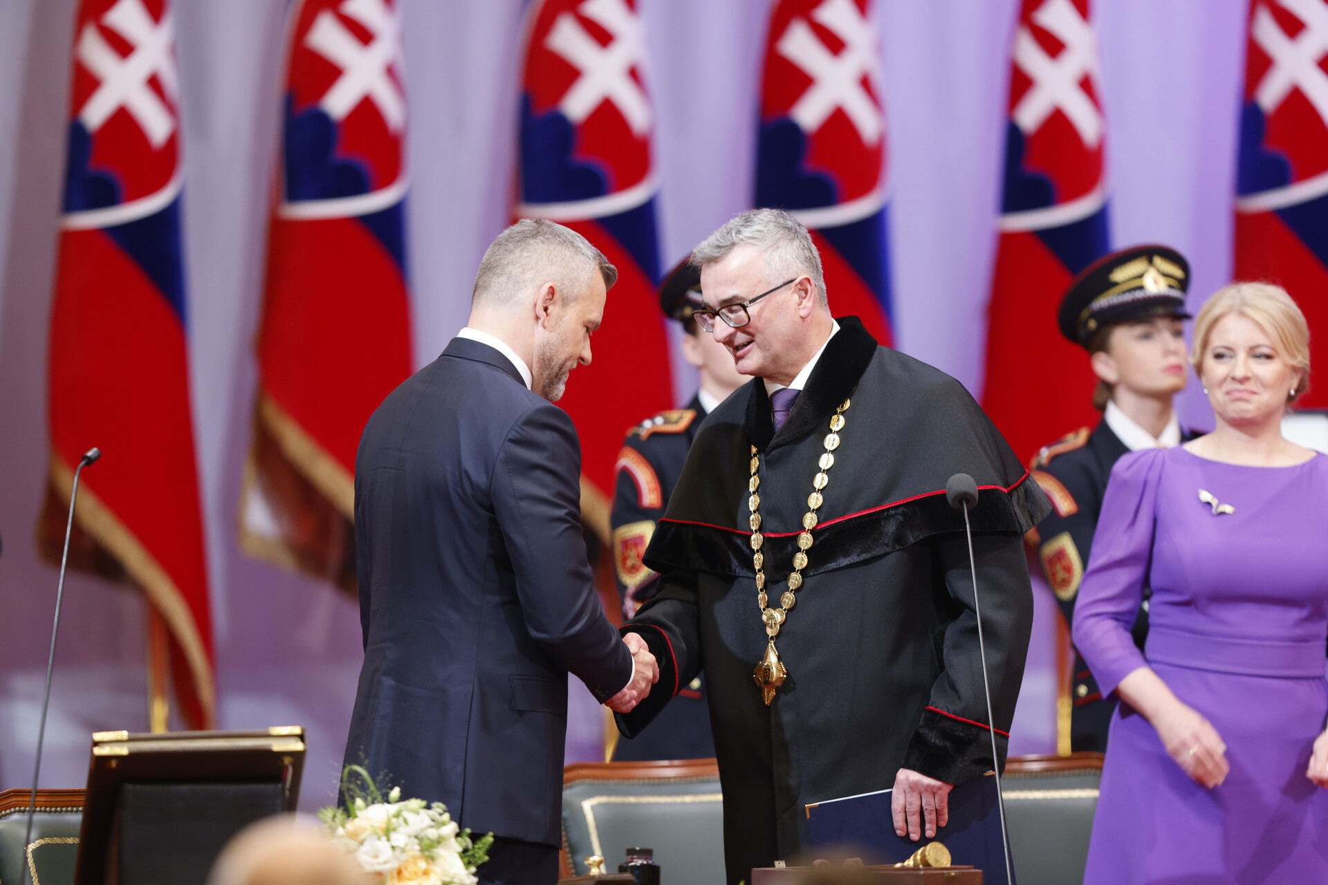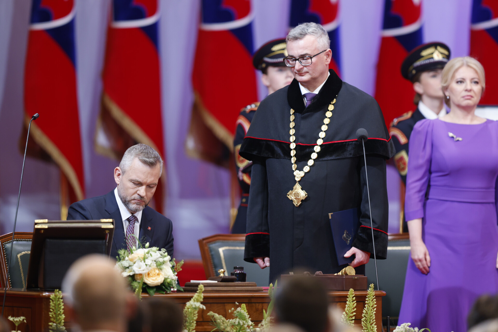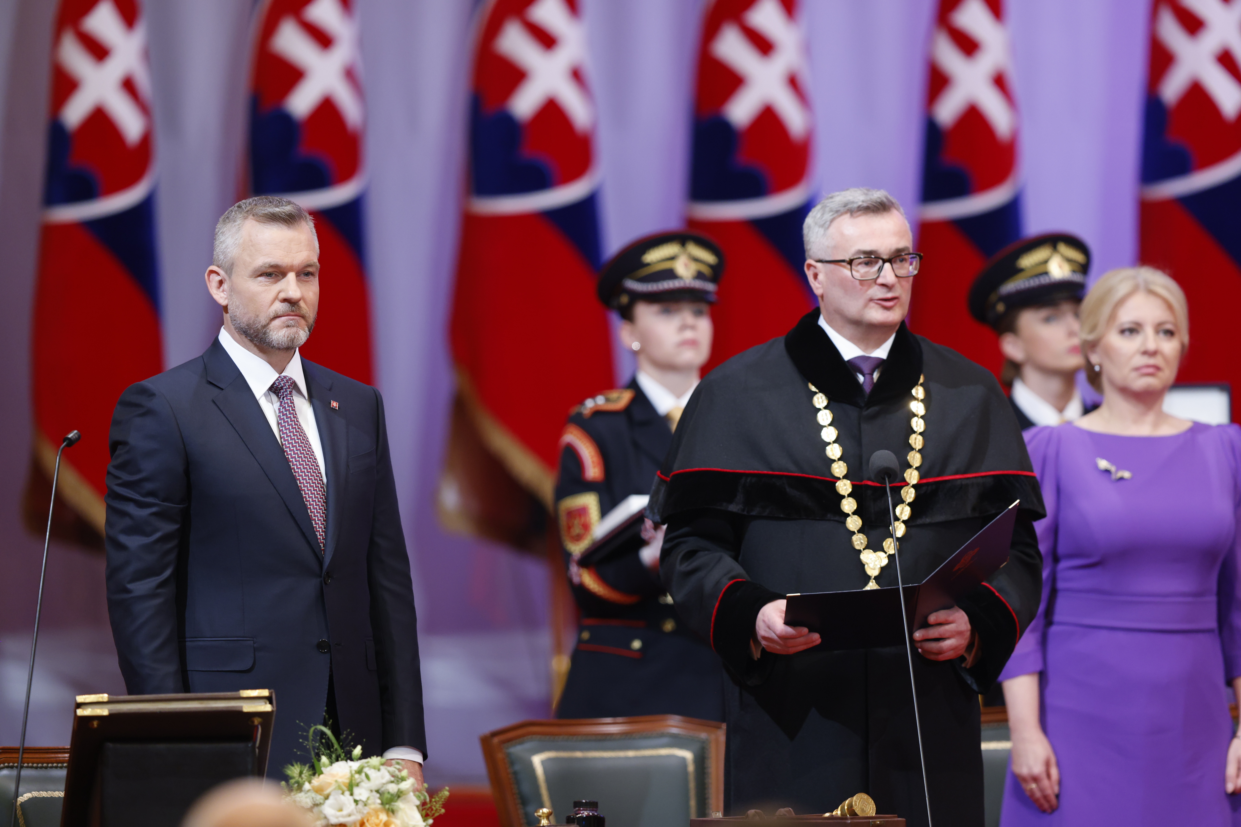Podľa čl. 101 ods. 7 Ústavy Slovenskej republiky kandidát zvolený za prezidenta Slovenskej republiky Peter Pellegrini dnes napoludnie zložil na slávnostnej schôdzi Národnej rady Slovenskej republiky v bratislavskej Redute sľub do rúk predsedu Ústavného súdu Slovenskej republiky Ivana Fiačana, ktorý následne osvedčil zloženie sľubu. Zároveň na základe zákona č. 522/2008 Z. z. o vyznamenaniach Slovenskej republiky v znení neskorších predpisov odovzdal prezidentovi najvyššie triedy všetkých štátnych vyznamenaní – Rad Andreja Hlinku, Rad Ľudovíta Štúra, Kríž Milana Rastislava Štefánika a Pribinov kríž.